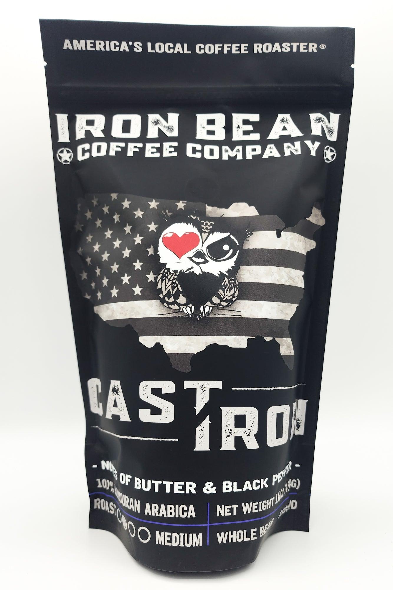 - Iron Bean's "CAST IRON" is a medium roast coffee made with 100% Single Origin Organic Honduran Arabica beans.