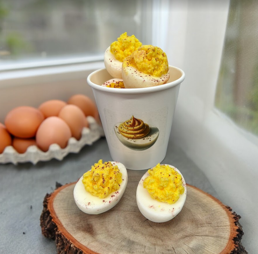 There are 4 deviled eggs wax melts per cup, for 6 oz in total.