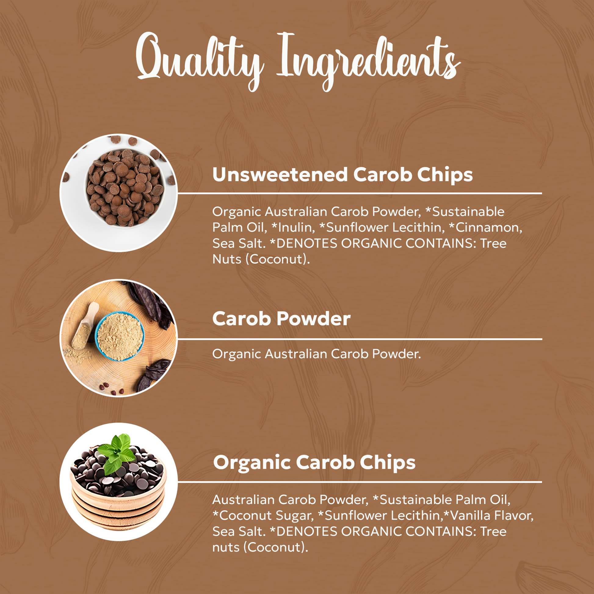 Always 100% Organic! Non-dairy, non-GMO, gluten-free, caffeine-free. We use a naturally sweet variety of Australian Carobs, sustainably produced palm oil, and coconut sugar. We never use cheap sugars or hydrogenated oils, ever!