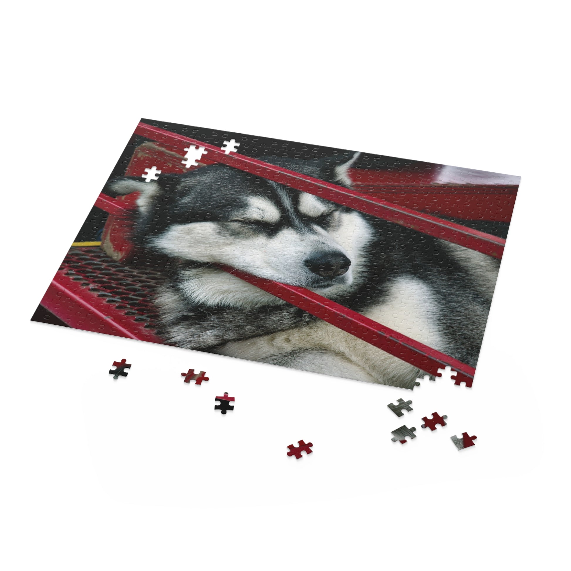 “Red Rail Rest” captures a moment of quiet companionship through Stanley Rippel’s lens—a Siberian Husky nestled between crimson bars, eyes closed in peaceful slumber. The contrast of bold metal and soft fur creates a striking composition, while the dog’s relaxed posture evokes warmth, trust, and stillness. Printed on premium chipboard and packaged in a gift-ready box featuring the puzzle design, this 500-piece puzzle invites reflection and connection. Perfect for animal lovers, design enthusiasts, or anyone drawn to the quiet poetry of everyday moments.