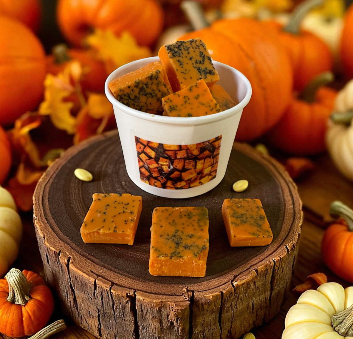 Roasted Pumpkin wax melts! These are little "cubes" of roasted pumpkin with poppy seeds to make it look like pepper on top!