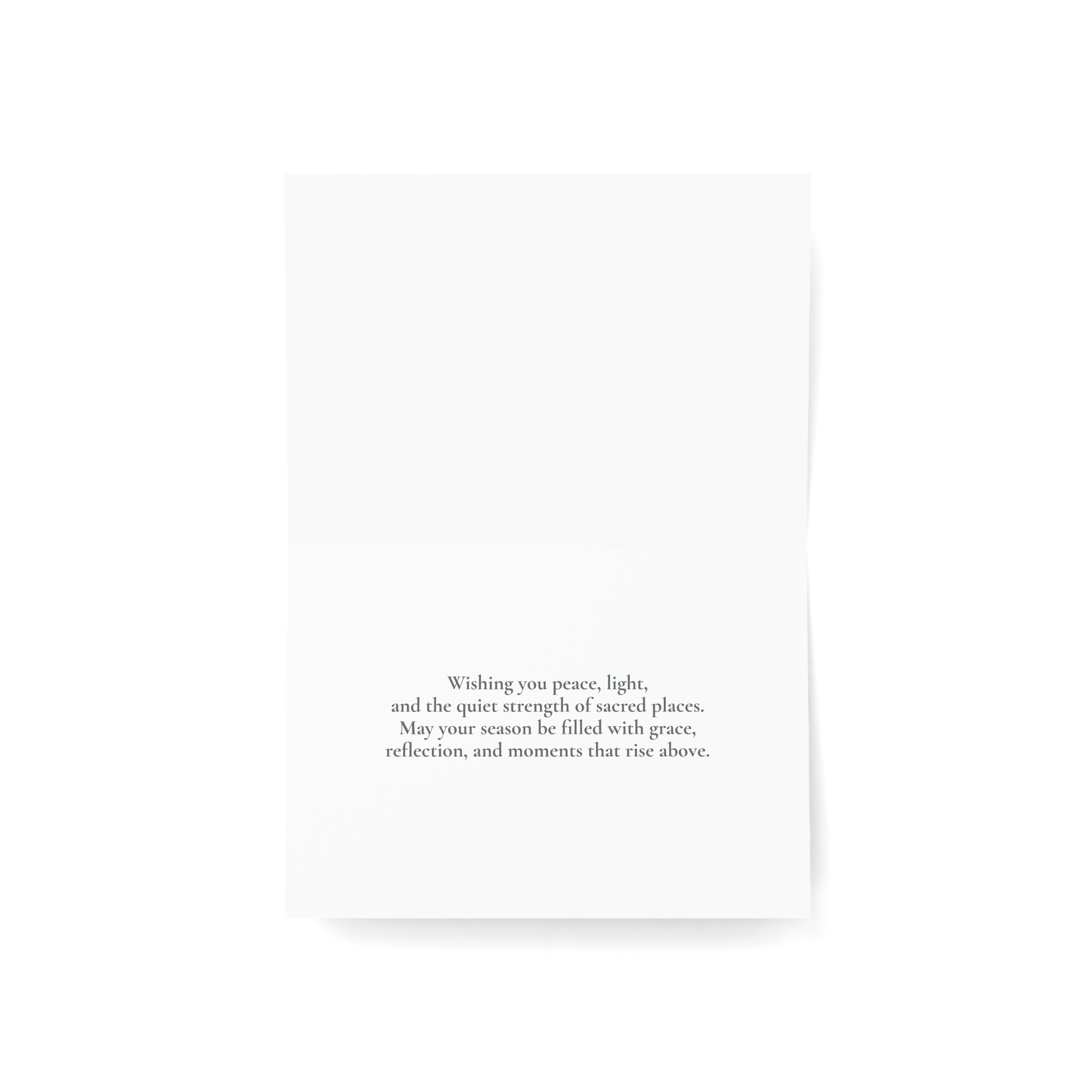 Celebrate the season with the luminous majesty of Mont Saint-Michel. “Sanctuary in Light” features Stanley Rippel’s photograph of the iconic abbey rising from the tidal island in Normandy, France—its spire aglow against the night sky, layered with centuries of sacred architecture. The golden illumination evokes both spiritual reverence and quiet wonder, making this card ideal for holiday correspondence, keepsakes, or gifts that honor tradition and timeless beauty. Printed on premium stock with a clean layout and gallery-quality finish.