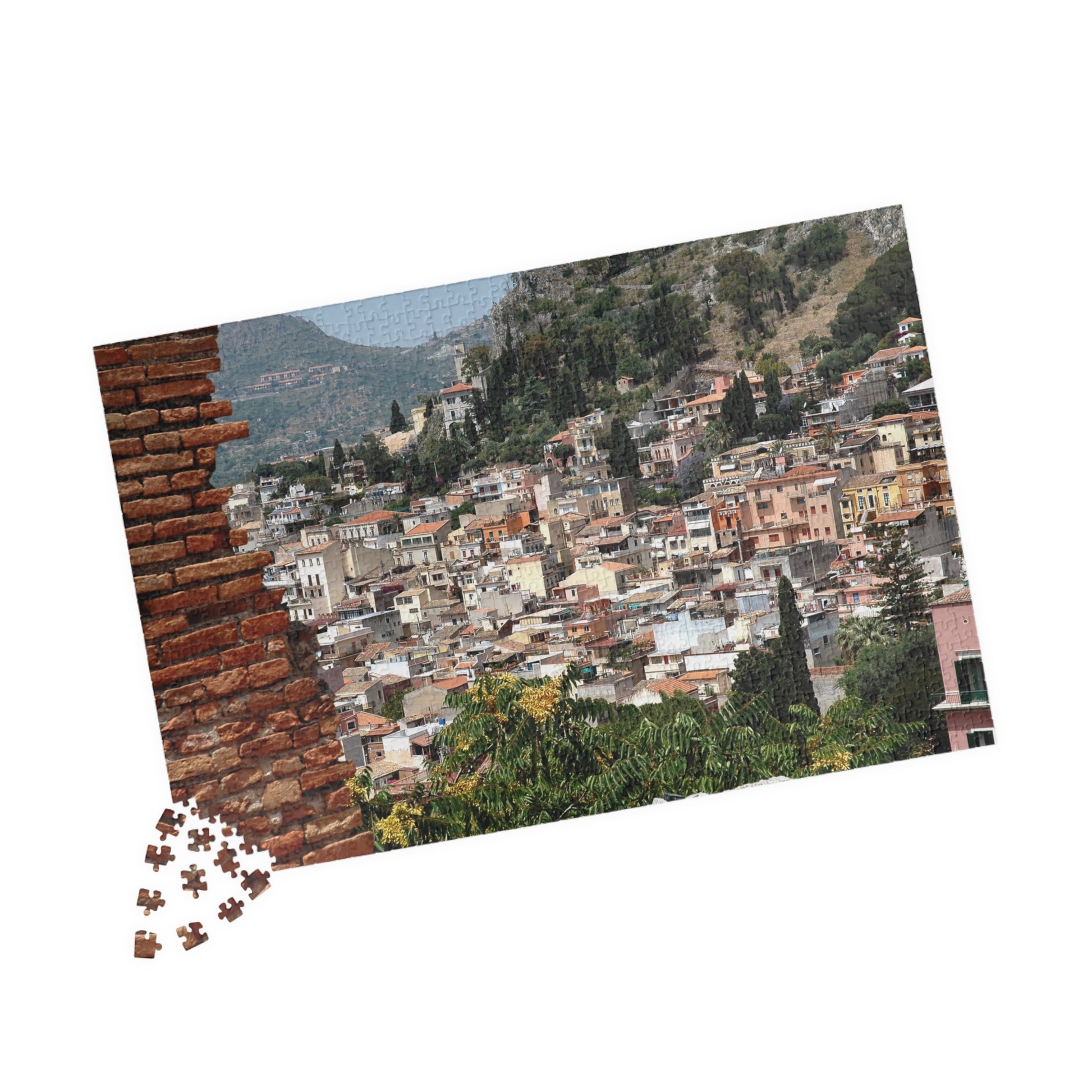 This puzzle features the hillside town of Taormina, Sicily, captured by photographer Stanley Rippel in a moment of layered beauty. Colorful buildings cascade down the slope in a dense architectural mosaic, framed by green foliage and a mountain rising quietly in the background. The scene blends urban texture with natural rhythm, evoking the charm of Southern European villages where history and landscape meet. Printed with clarity and care, this puzzle invites slow, thoughtful assembly and offers a keepsake of one of Sicilyâs most scenic corners.