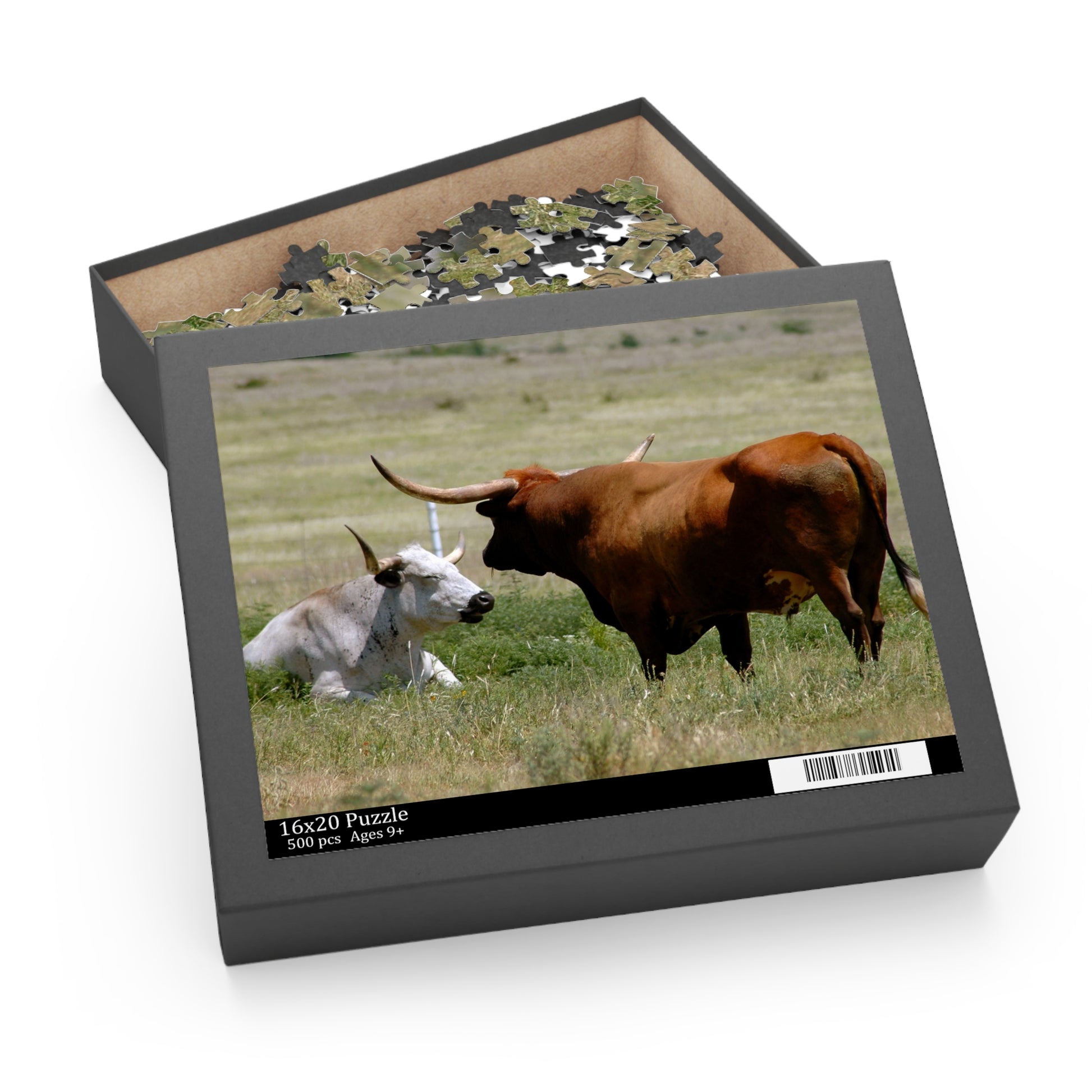 This puzzle features two Texas Longhorn cattle captured in a moment of quiet connection, photographed by Stanley Rippel. One rests in the grass, white with dark spots, while the other stands nearby in rich reddish-brown—both framed by long, curved horns and the open stillness of a rural field. The image blends strength and serenity, offering a meditative puzzle experience rooted in the American Southwest. Printed with clarity and care, it’s a tribute to the resilience and beauty of this iconic breed and the artistry of a photographer who honors the land and its legacy.