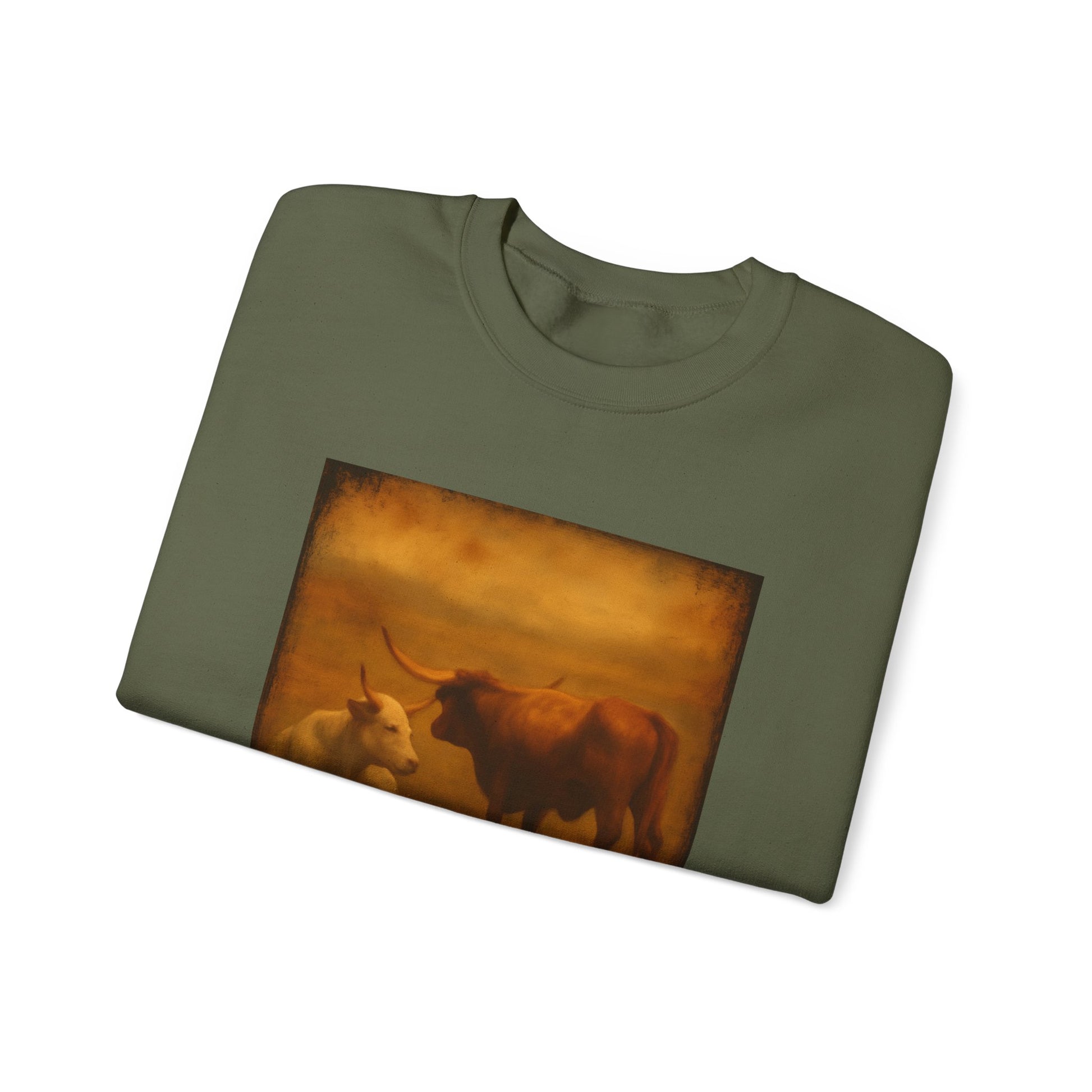 Strength in stillness. This heavyweight black sweatshirt features a painterly longhorn scene—two cattle in quiet communion beneath a golden sky. The word “Unbothered” anchors the design in calm resilience, blending Western grit with modern minimalism. Soft, warm, and emotionally magnetic, this piece honors protector energy and the quiet power of presence.